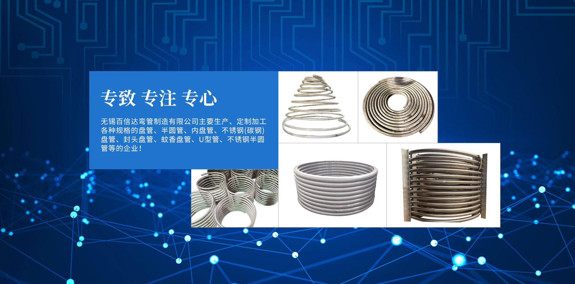 無錫百信達(dá)彎管制造有限公司位于經(jīng)濟(jì)發(fā)達(dá)、風(fēng)景秀麗的太湖之濱。本公司擁有完整、科學(xué)的質(zhì)量管理體系,公司的誠信、實(shí)力和產(chǎn)品質(zhì)量獲得業(yè)界的認(rèn)可。公司專注生產(chǎn)、定制加工各種規(guī)格的盤管、半圓管、內(nèi)盤管、不銹鋼盤管、封頭盤管、蚊香盤管、U型管、不銹鋼半圓管、碳鋼盤管等的企業(yè)。本公司設(shè)計(jì)加工的彎管設(shè)備,質(zhì)量精良、結(jié)構(gòu)合理,效率高、操作簡易、經(jīng)久耐用。公司已經(jīng)承接了各地多個(gè)大型場(chǎng)館工程項(xiàng)目的彎管加工,屢次得到了多家大客戶的好評(píng)。努力滿足客戶的需要,不斷提高自身水平是公司追求的目標(biāo)。歡迎社會(huì)各界朋友蒞臨無錫百信達(dá)彎管制造有限公司參觀、指導(dǎo)和業(yè)務(wù)洽談!
